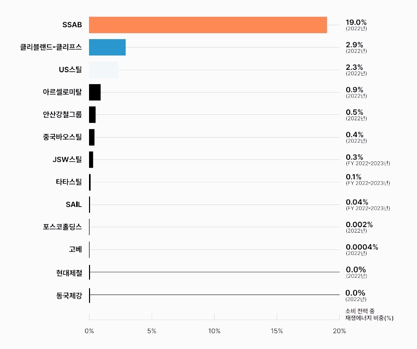 특히 2022년 기준 스웨덴 철강사 SSAB의 재생에너지 사용 비중이 19%로 가장 높았던 반면, 현대제철과 동국제강은 최하위였다. 포스코는 0.002%로 사실상 ‘제로(0)’ 수준이다.